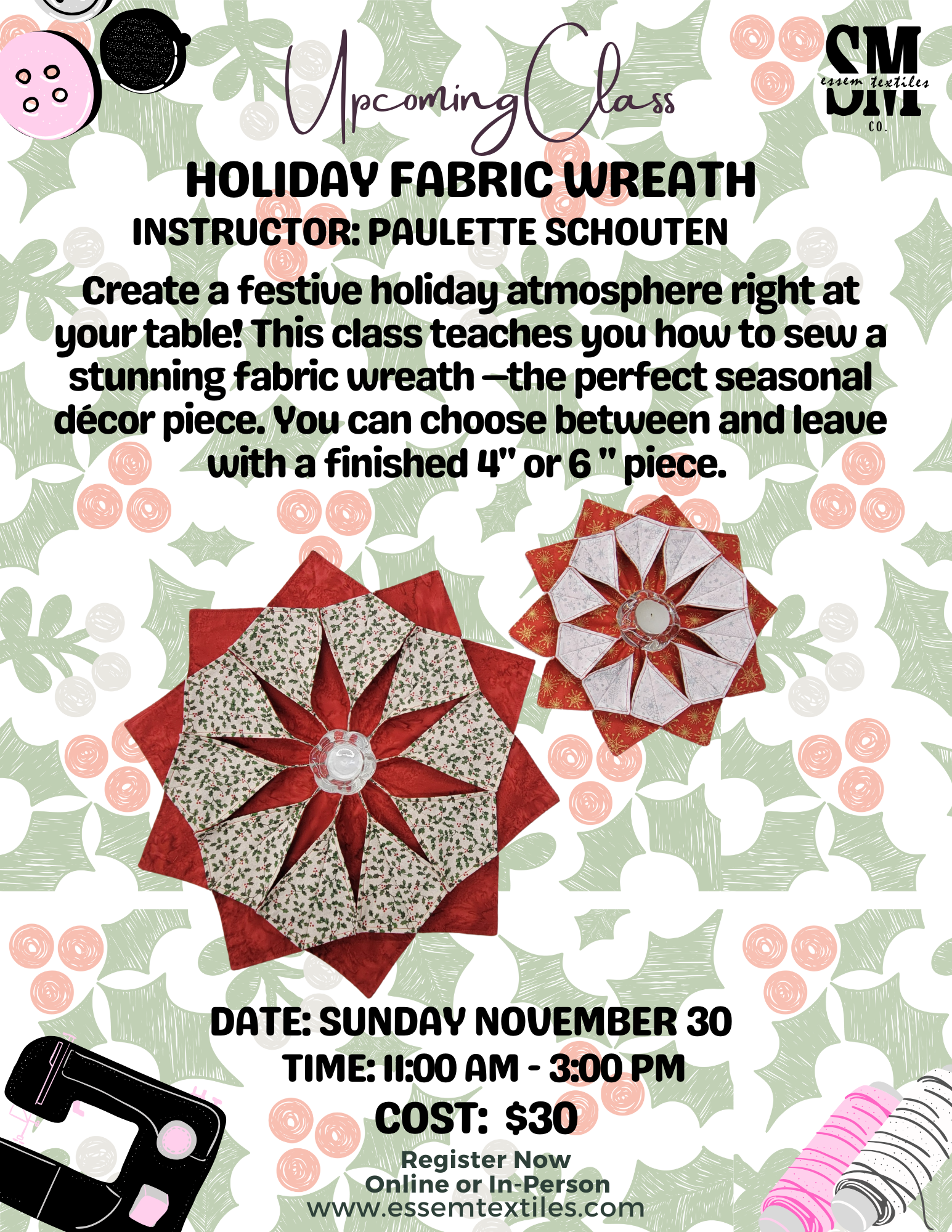 Using simple techniques and cotton material, you'll stitch together vibrant fabrics into an eye-catching design that's easier than it looks. Best of all, you'll leave class with a completed, ready-to-display wreath that brings holiday cheer to your home.